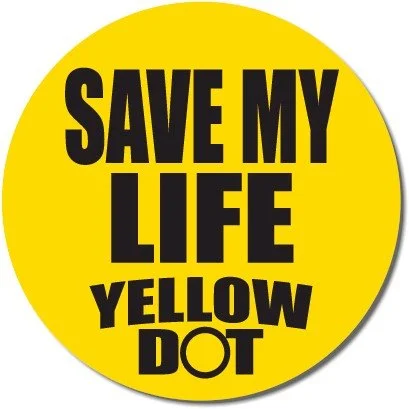 A Yellow Dot in the bottom left corner of the rear window of your vehicle and on the side of your refrigerator will alert all First Responders to the vital medical information in your glove box. This will help ensure that you receive the medical care you need during that first ‘Golden Hour’ after a crash or other emergency.